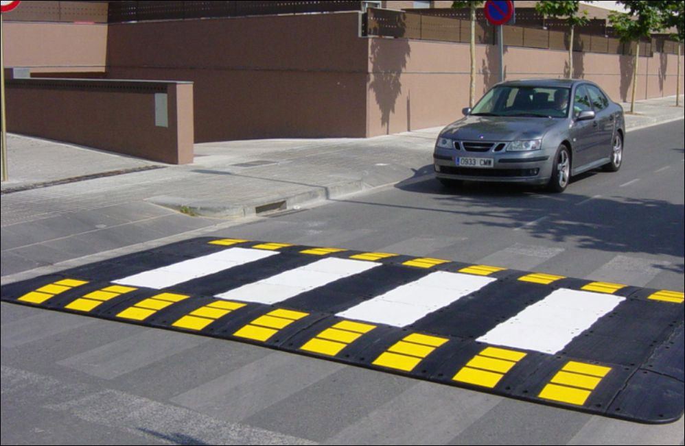 A la goma natural que utilizamos para fabricar los pasos elevados mezclamos un 15% de microfibra de nylon y así conseguimos mantener la flexibilidad de la goma evitando deformaciones producidas por el tráfico y por los efectos climatológicos. Las combinaciones de medidas tanto de ancho como de largo son ilimitadas.